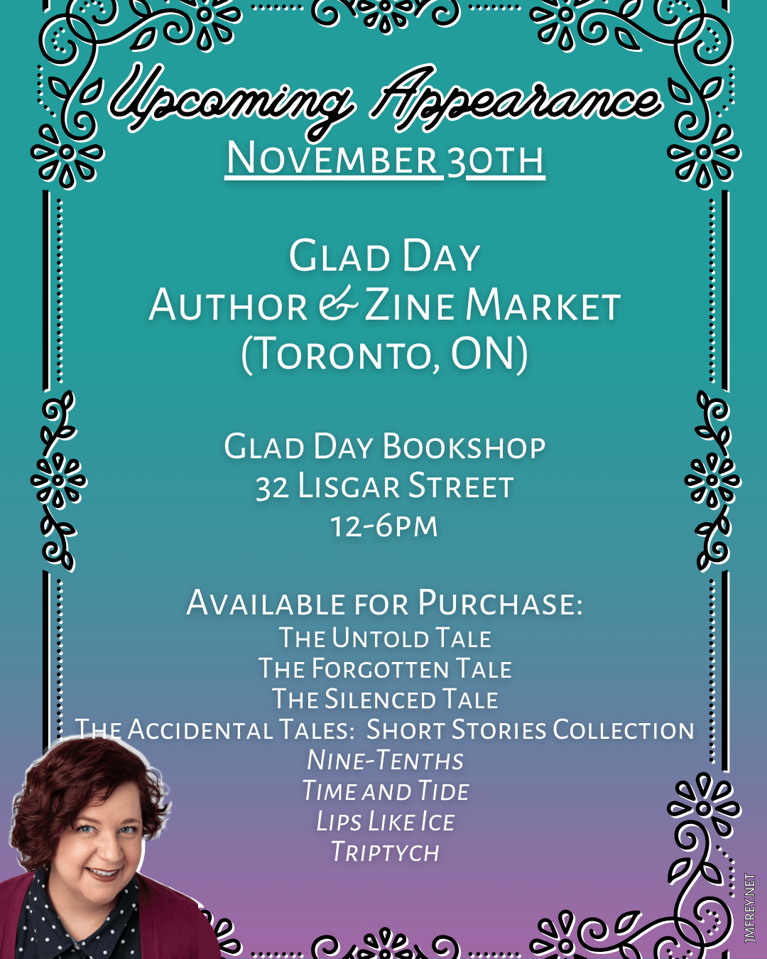 Join me at Glad Day Bookshop in their new space at 32 Lisgar Street on November 30th for the Author & Zine Market! It’s the perfect time to pick up some holiday gifts, or just treat yourself. I’ll be selling copies of Nine-Tenths, Triptych, Time and Tide, Lips Like Ice, and all four of the Accidental Turn Series fantasy books. See you there!